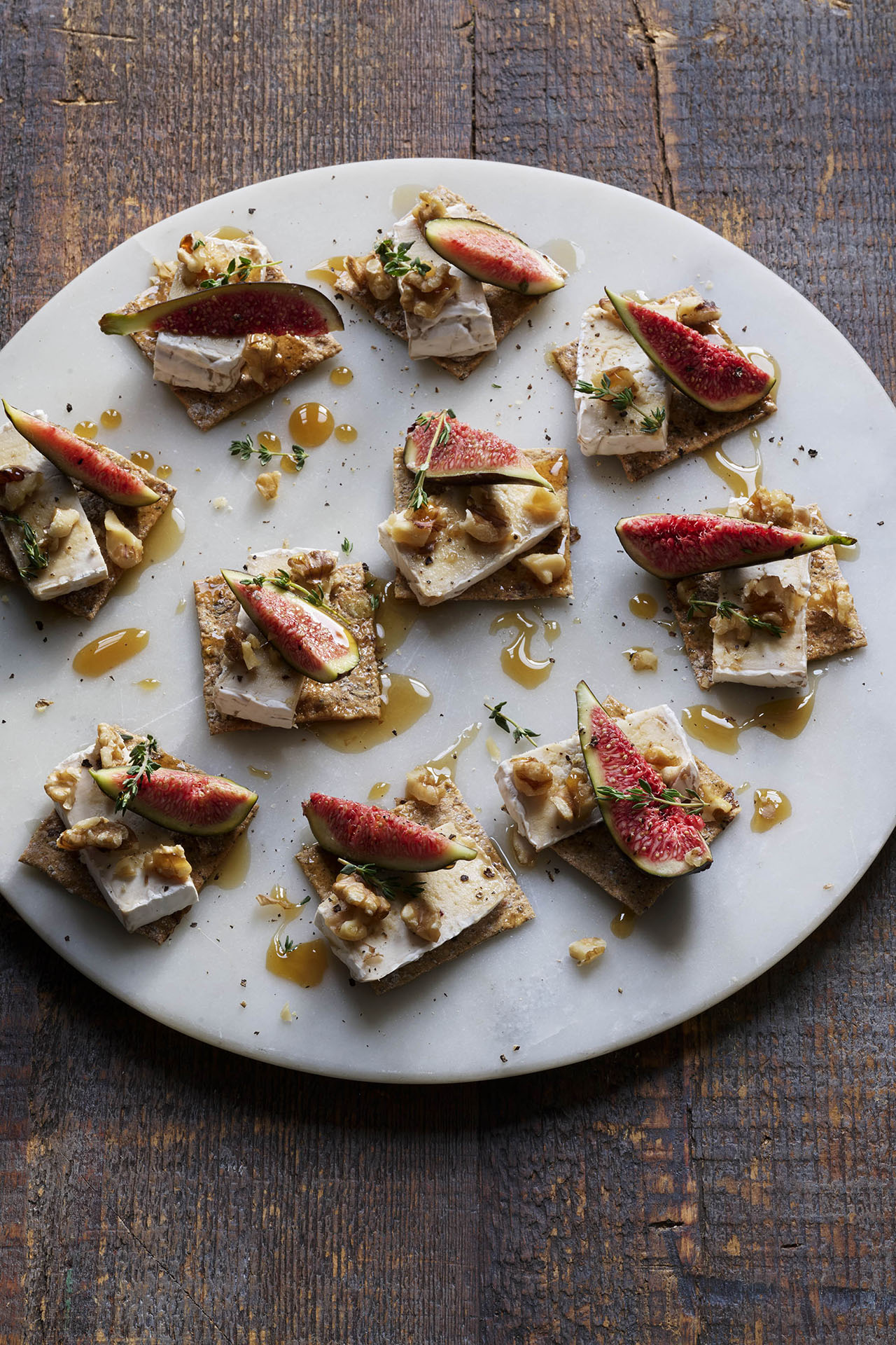 Crisp crackers topped with creamy goat cheeze, sweet figs, crunchy walnuts, and a drizzle of agave for a bite of rich and natural decadence.